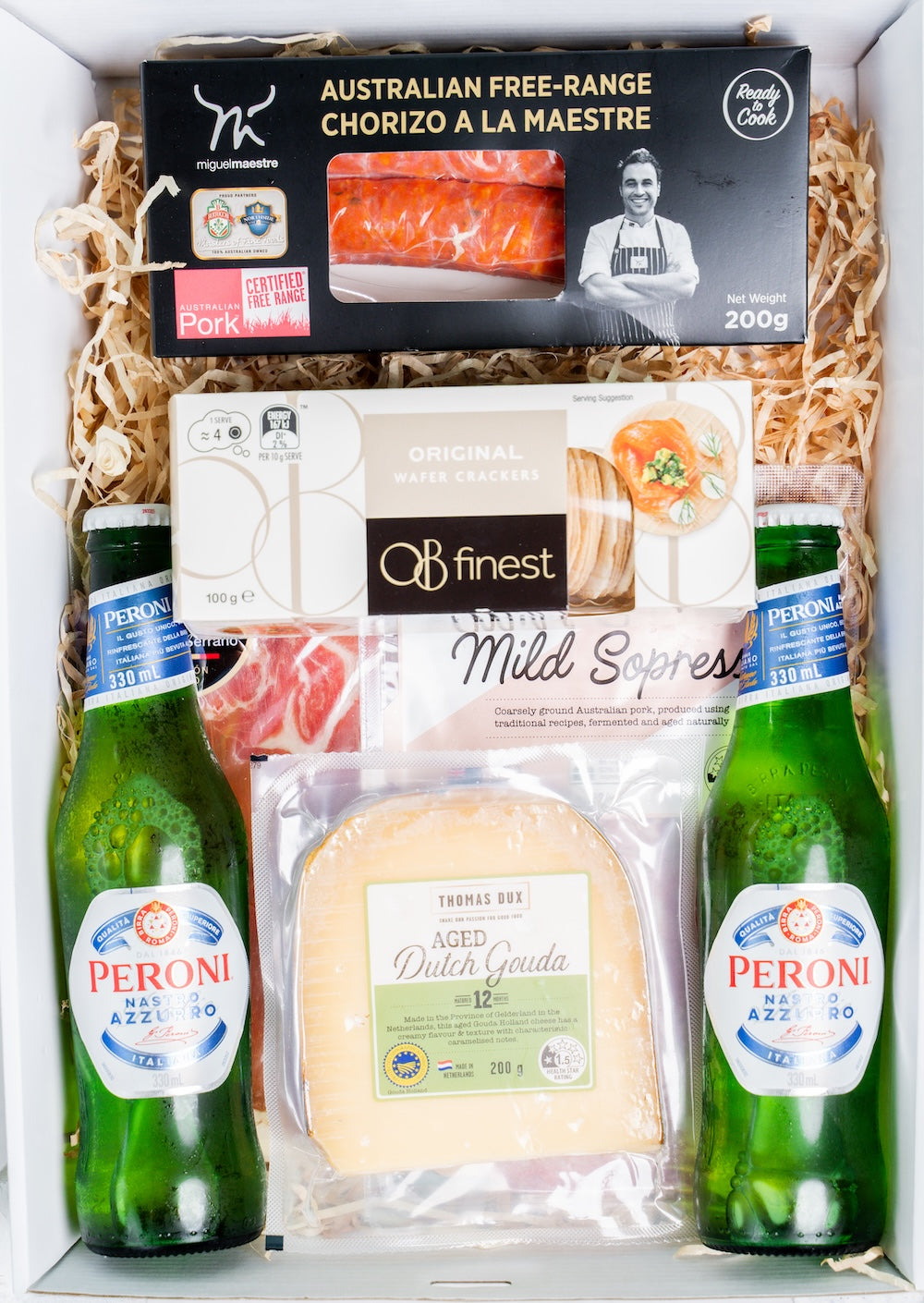 The Wild Pansi Gent's hamper includes: aged Dutch gouda, Thomas Dux Wild Boar salami and Truffle salami, San Marino prosciutto, Montecatini spanish chorizo, water crackers and two bottles of premium Peroni Nastro Azzurro 330ml.