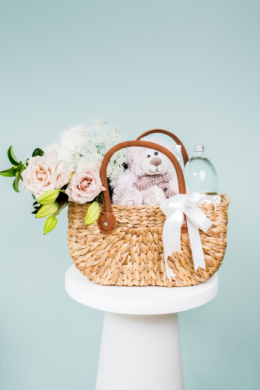 This gift basket is perfect for the new Mum. A Robert Gordon sued natural basket is filled with fresh flowers a plush teddy in your choice of brown, pink or blue, New Farm confectionary milk chocolate 200g rocky road and Soaked Body Bath milk bath bomb.
