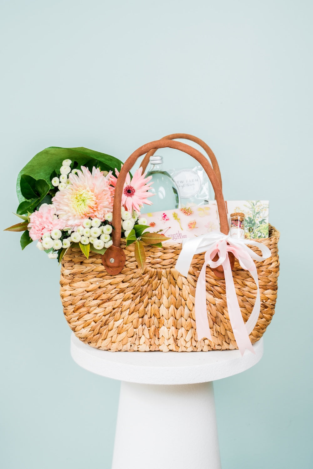 This gift basket is the way to show someone you truly Adore them. The large Robert Gordon sued harvest basket is filled with a bunch of fresh seasonal flowers, a myrtle and moss ceramic gift boxed candle, New Farm confectionary white chocolate 20g rocky road, a Antipode 1 Ltre bottled water and a Soaked Body Bar Hydrating Milk Soak. A very special gift for a very special occasion